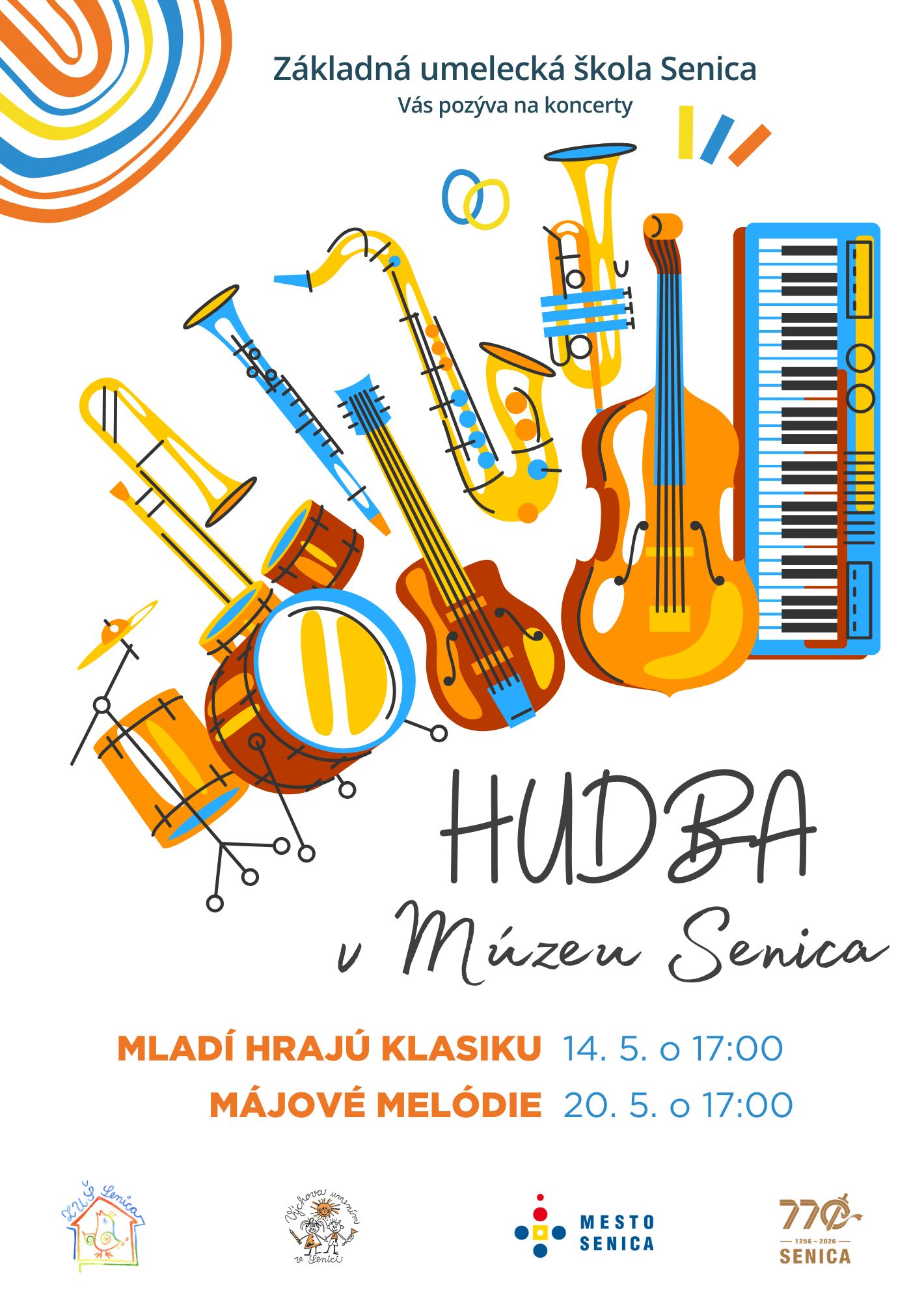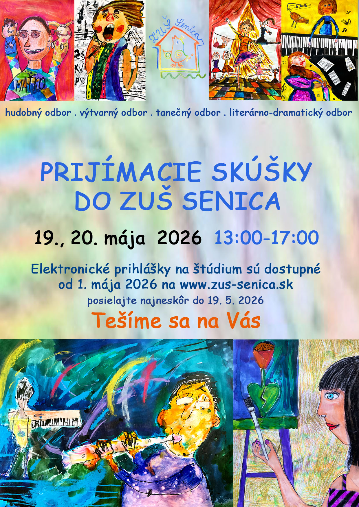 Prijímacie skúšky do našej Základnej umeleckej školy v Senici pre ďalší školský rok 2026 / 2027 budú prebiehať v dňoch 19. 5. 2026 (utorok) -20. 5. 2026 (streda) v budove našej školy medzi 13:00 - 17:00 hod. Kedykoľvek v uvedenom čase nás môžete so svojim dieťaťom navštíviť.